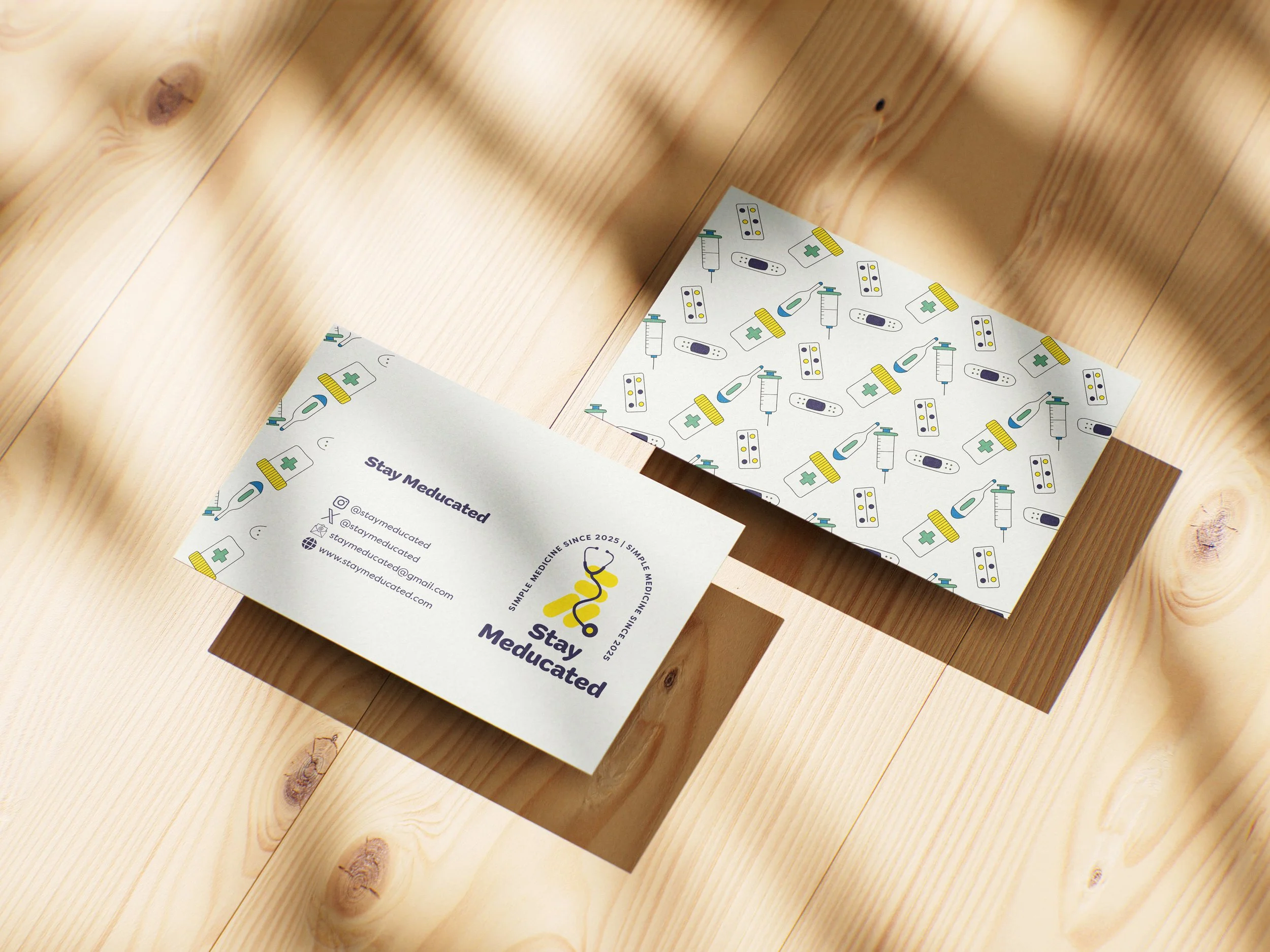 The client opted for a simple brand business card in keeping with the simplicity of the brand. The brand pattern was created using the brand colours and miscellaneous medical equipment to add the medical aspect back into the brand identity.